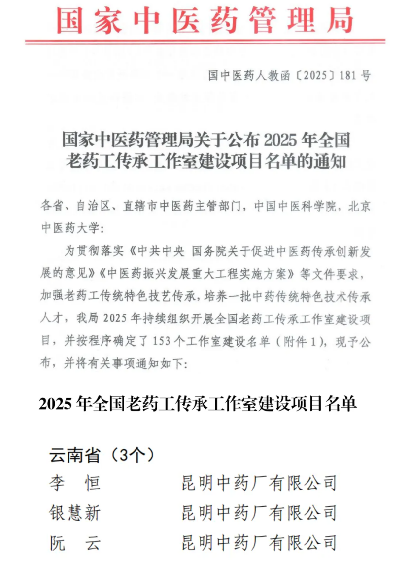 近日,国家中医药管理局正式公布2025年“全国老药工传承工作室”建设项目名单,昆中药李恒、阮云、银慧新三名专家成功入选。至此,包含2024年首批入选的“张元昆全国老药工传承工作室”,昆中药共有四名专家...